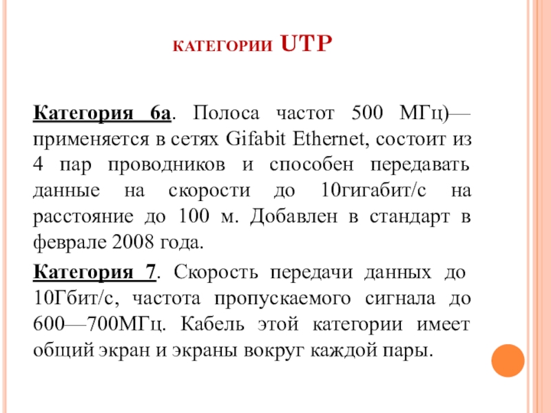 Категория 6а. Полоса частот 500 МГц)—применяется в сетях Gifabit Ethernet,