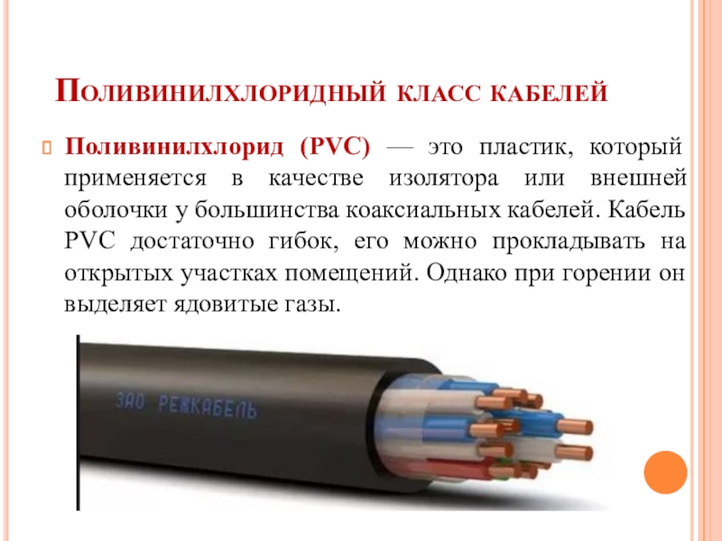 изолятора или внешней оболочки у большинства коаксиальных кабелей. Кабель PVC достаточно гибок, его можно прокладывать на открытых участках помещений. Однако при горении он выделяет ядовитые газы.