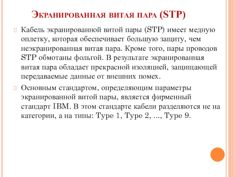 Основным стандартом, определяющим параметры экранированной витой пары, является фирменный стандарт IBM. В этом стандарте кабели разделяются не на категории, а на типы: Type 1, Type 2, ..., Type 9.