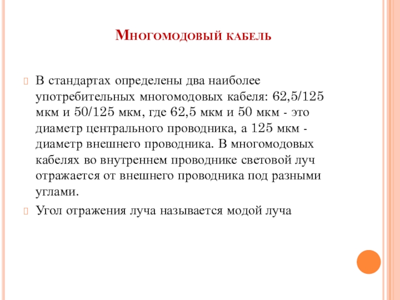 и 50/125 мкм, где 62,5 мкм и 50 мкм - это диаметр центрального проводника, а 125 мкм - диаметр внешнего проводника. В многомодовых кабелях во внутреннем проводнике световой луч отражается от внешнего проводника под разными углами.