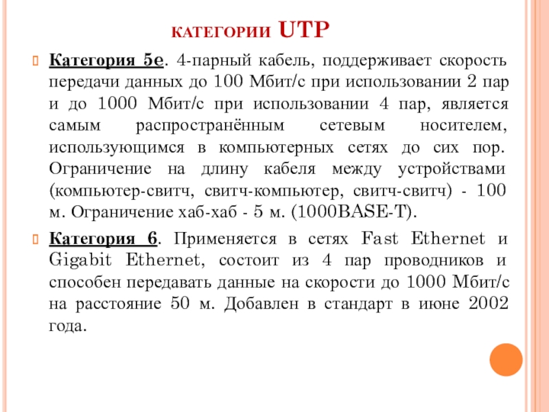 Мбит/с при использовании 2 пар и до 1000 Мбит/с при использовании 4 пар, является самым распространённым сетевым носителем, использующимся в компьютерных сетях до сих пор. Ограничение на длину кабеля между устройствами (компьютер-свитч, свитч-компьютер, свитч-свитч) - 100 м. Ограничение хаб-хаб - 5 м. (1000BASE-T).