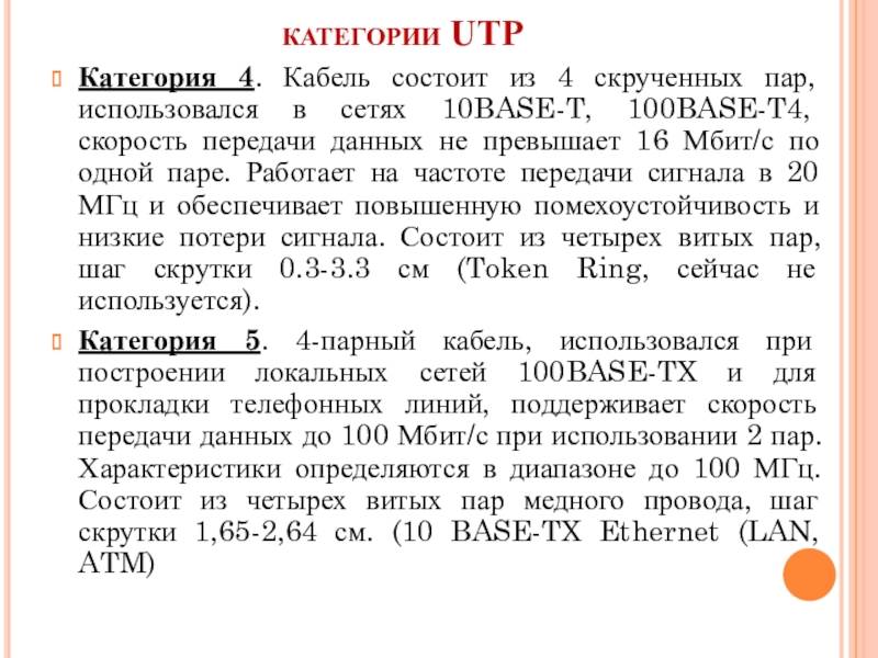 Категория 5. 4-парный кабель, использовался при построении локальных сетей 100BASE-TX и для прокладки телефонных линий, поддерживает скорость передачи данных до 100 Мбит/с при использовании 2 пар. Характеристики определяются в диапазоне до 100 МГц. Состоит из четырех витых пар медного провода, шаг скрутки 1,65-2,64 см. (10 BASE-TX Ethernet (LAN, ATM)