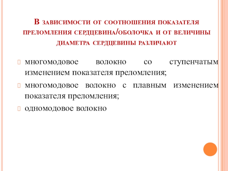 Слайд 26В зависимости от соотношения показателя преломления сердцевина/оболочка и от величины диаметра