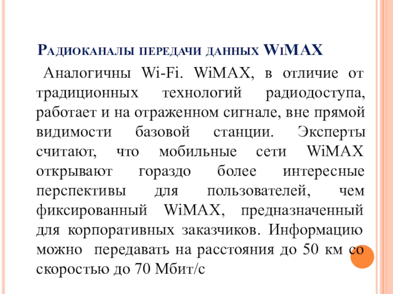 технологий радиодоступа, работает и на отраженном сигнале, вне прямой видимости базовой станции. Эксперты считают, что мобильные сети WiMAX открывают гораздо более интересные перспективы для пользователей, чем фиксированный WiMAX, предназначенный для корпоративных заказчиков. Информацию можно передавать на расстояния до 50 км со скоростью до 70 Мбит/с