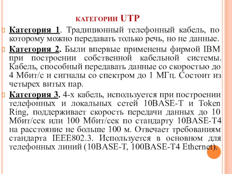 Категория 1. Традиционный телефонный кабель, по которому можно передавать