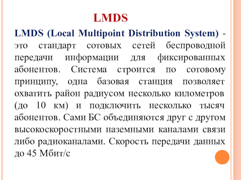 передачи информации для фиксированных абонентов. Система строится по сотовому принципу, одна базовая станция позволяет охватить район радиусом несколько километров (до 10 км) и подключить несколько тысяч абонентов. Сами БС объединяются друг с другом высокоскоростными наземными каналами связи либо радиоканалами. Скорость передачи данных до 45 Мбит/c