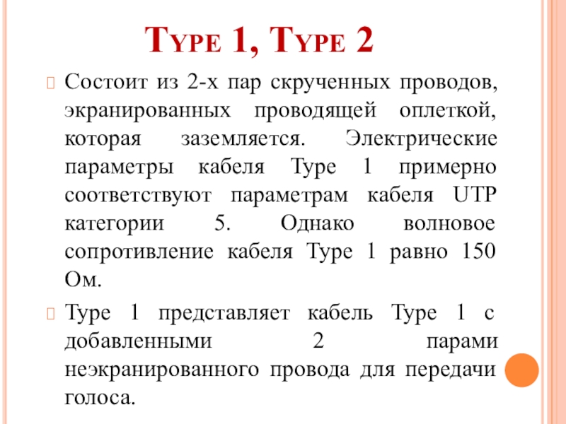 оплеткой, которая заземляется. Электрические параметры кабеля Type 1 примерно соответствуют параметрам кабеля UTP категории 5. Однако волновое сопротивление кабеля Type 1 равно 150 Ом.