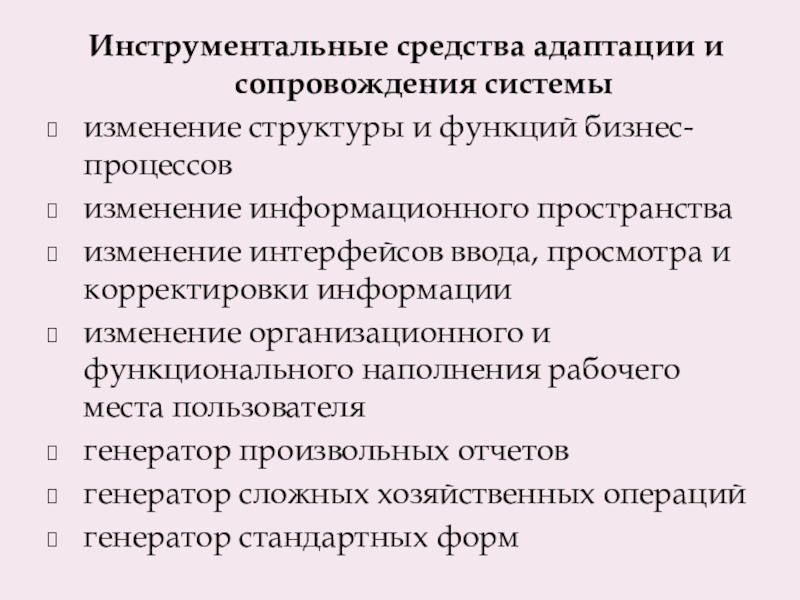 Слайд 14Инструментальные средства адаптации и сопровождения системы