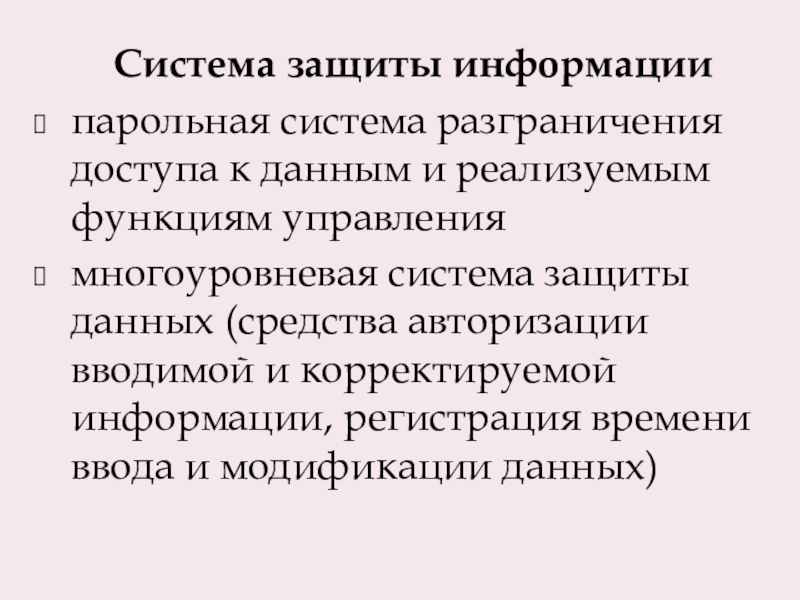 многоуровневая система защиты данных (средства авторизации вводимой и корректируемой информации, регистрация времени ввода и модификации данных)