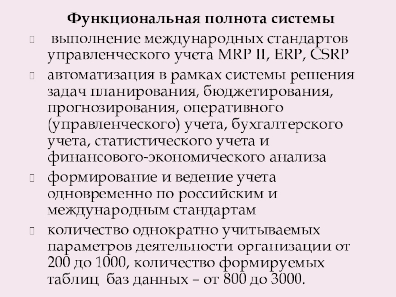 выполнение международных стандартов управленческого учета MRP II, ERP, CSRP