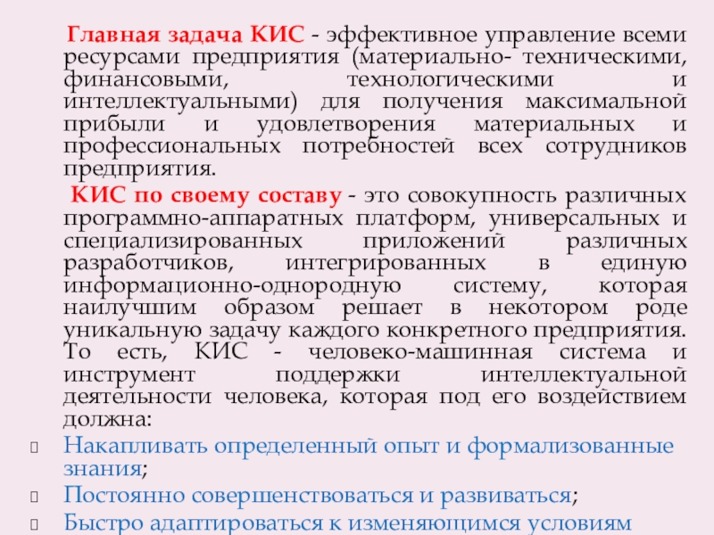 КИС по своему составу - это совокупность различных программно-аппаратных платформ, универсальных и специализированных приложений различных разработчиков, интегрированных в единую информационно-однородную систему, которая наилучшим образом решает в некотором роде уникальную задачу каждого конкретного предприятия. То есть, КИС - человеко-машинная система и инструмент поддержки интеллектуальной деятельности человека, которая под его воздействием должна: