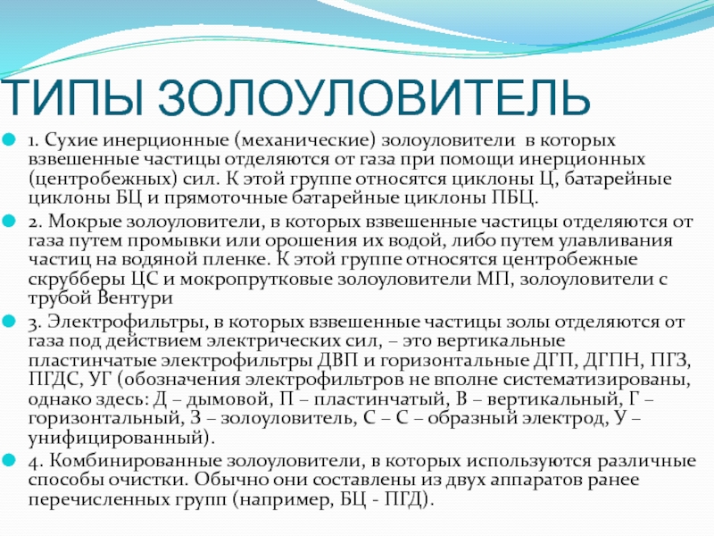 Слайд 3ТИПЫ ЗОЛОУЛОВИТЕЛЬ