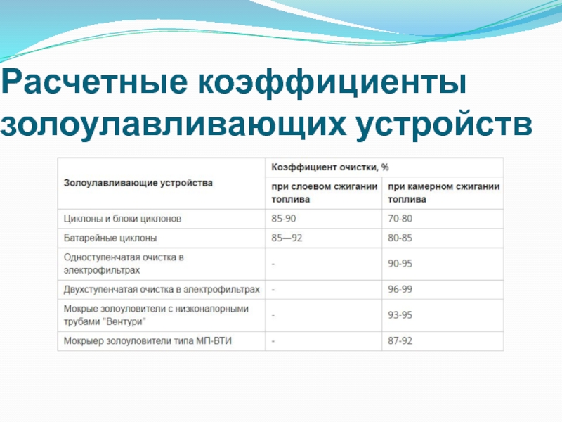 Слайд 5Расчетные коэффициенты золоулавливающих устройств