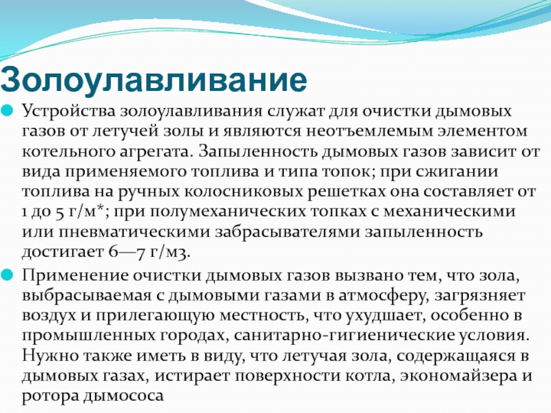 Золоулавливание Устройства золоулавливания служат для очистки дымовых газов от летучей золы и являются неотъемлемым элементом котельного агрегата.