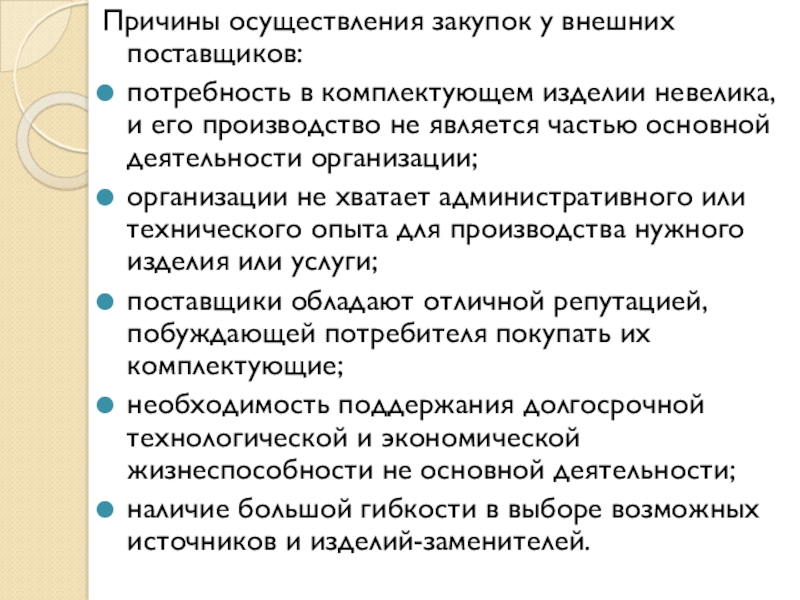 Слайд 23Причины осуществления закупок у внешних поставщиков:
