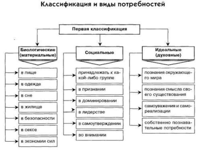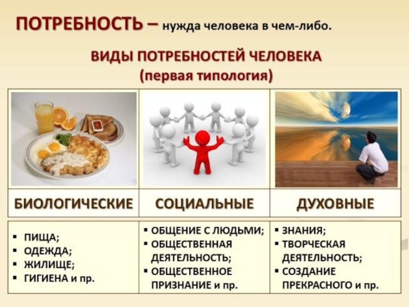 • физиологические потребности, необходимые для выживания человека: в еде, в воде, в отдыхе и т.д.;