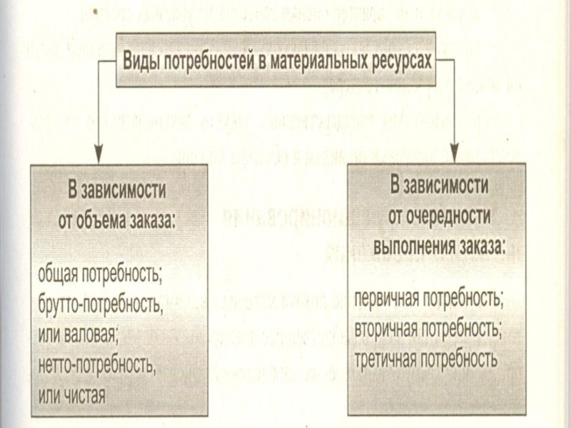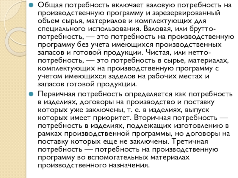 Первичная потребность определяется как потребность в изделиях, договоры на производство и поставку которых уже заключены, т. е. в изделиях, выпуск которых имеет приоритет. Вторичная потребность — потребность в изделиях, подлежащих изготовлению в рамках производственной программы, но договоры на поставку которых еще не заключены. Третичная потребность — потребность на производственную программу во вспомогательных материалах производственного назначения.