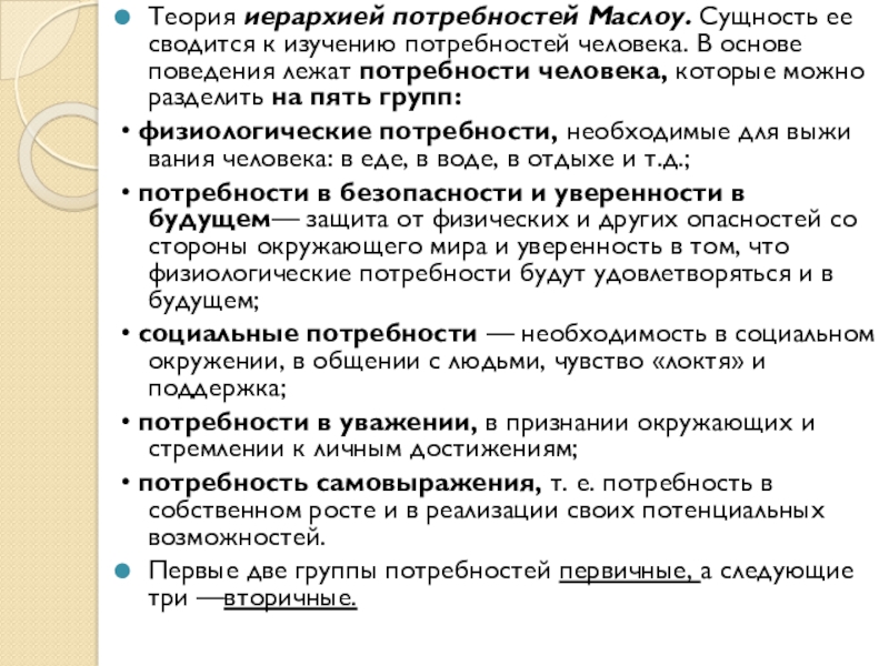 Слайд 7Теория иерархией потребностей Маслоу. Сущность ее сводится к изучению потребностей человека. В основе