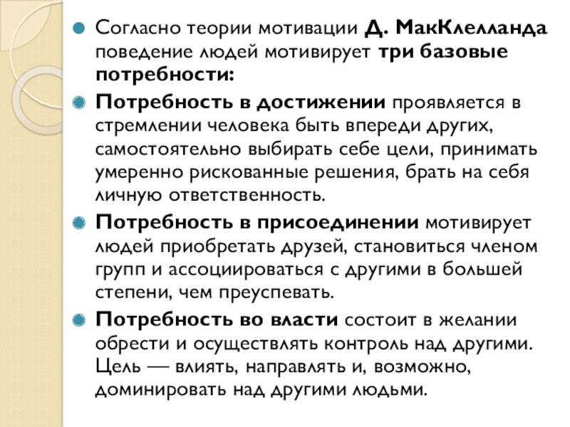 Слайд 10Согласно теории мотивации Д. МакКлелланда поведение людей мотивирует три базовые потребности: