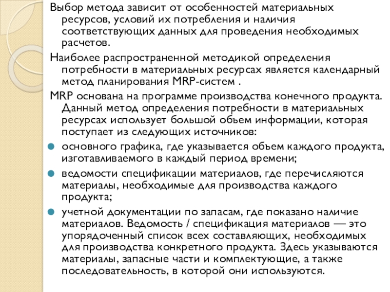 Слайд 18Выбор метода зависит от особенностей материальных ресурсов, условий их потребления и