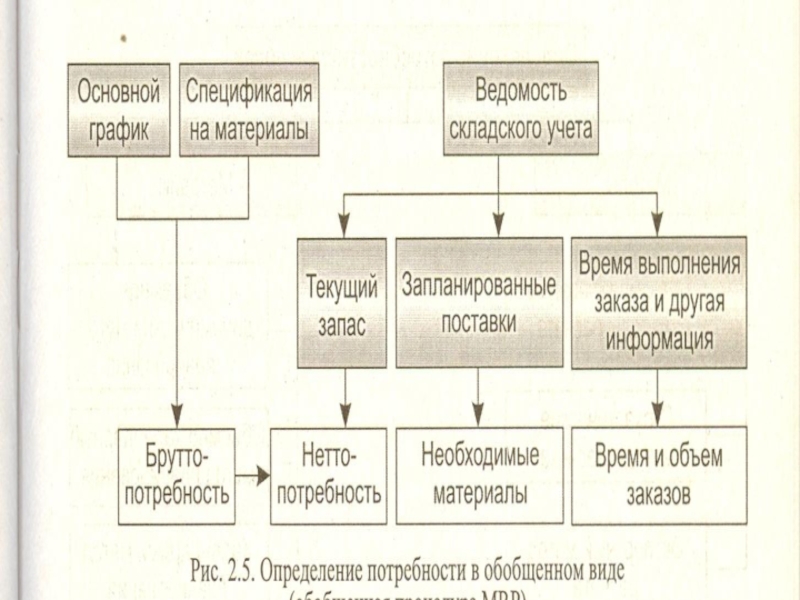 определение чистой потребности путем вычитания уже имеющегося запаса и объема заказов, которые должны поступить. Затем составляется производственный график с указанием времени начала работ, обеспеченных чистой потребностью;