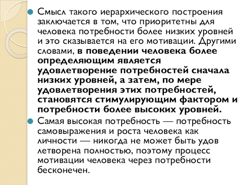 Самая высокая потребность — потребность самовыражения и роста человека как личности — никогда не может быть удовлетворена полностью, поэтому процесс мотивации человека через потребности бесконечен.