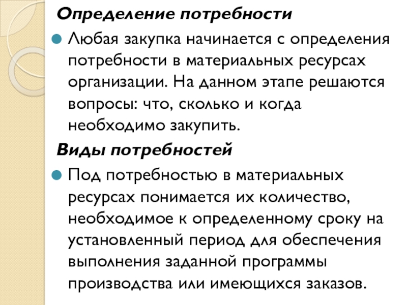 Любая закупка начинается с определения потребности в материальных ресурсах организации.