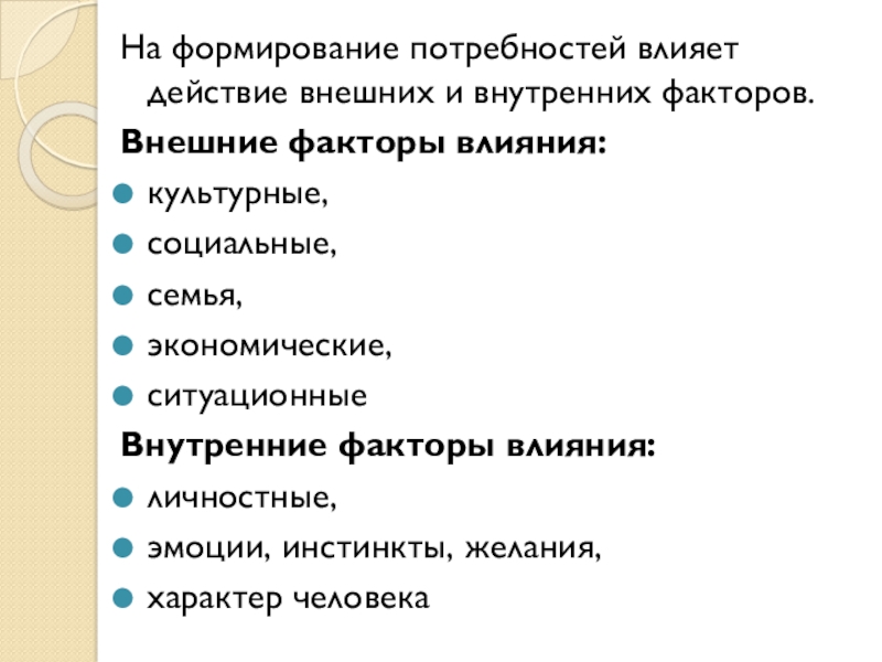 Слайд 11На формирование потребностей влияет действие внешних и внутренних факторов.