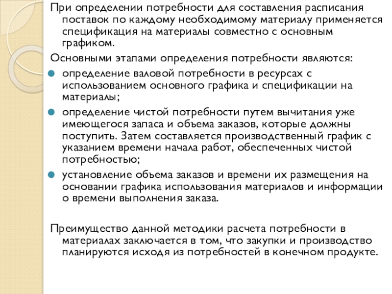 Слайд 20При определении потребности для составления расписания поставок по каждому необходимому материалу