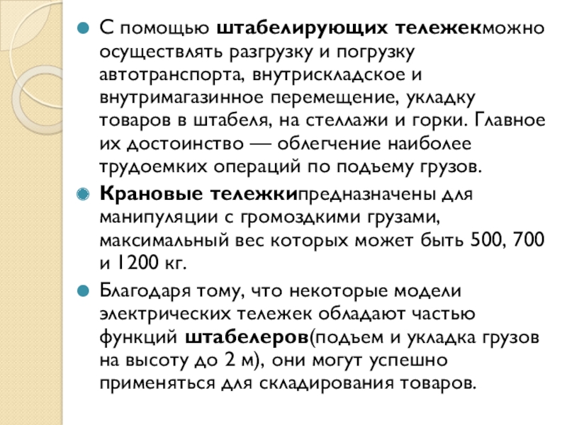 перемещение, укладку товаров в штабеля, на стеллажи и горки. Главное их достоинство — облегчение наиболее трудоемких операций по подъему грузов.