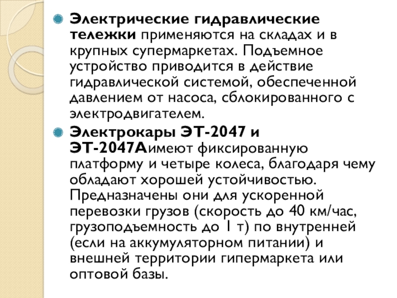 Слайд 14Электрические гидравлические тележки применяются на складах и в крупных супермаркетах. Подъемное