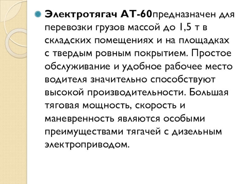 Слайд 15Электротягач АТ-60предназначен для перевозки грузов массой до 1,5 т в складских