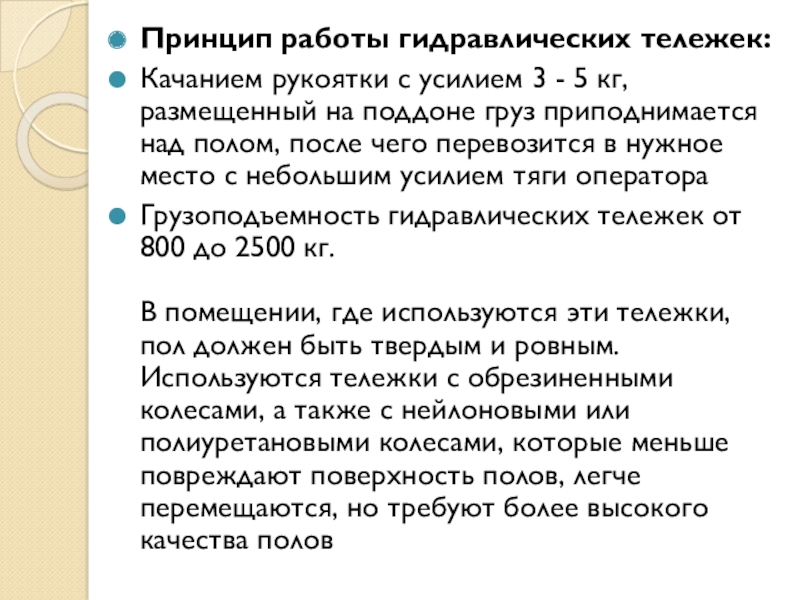 Слайд 10Принцип работы гидравлических тележек: