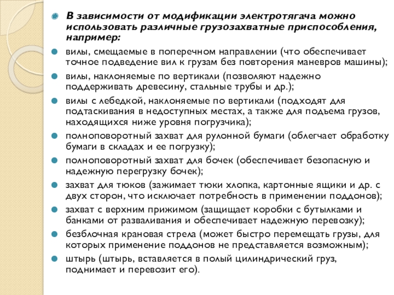 Слайд 16В зависимости от модификации электротягача можно использовать различные грузозахватные приспособления, например: