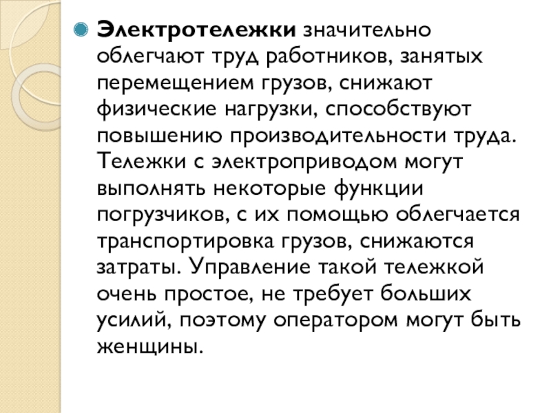 Слайд 13Электротележки значительно облегчают труд работников, занятых перемещением грузов, снижают физические нагрузки,