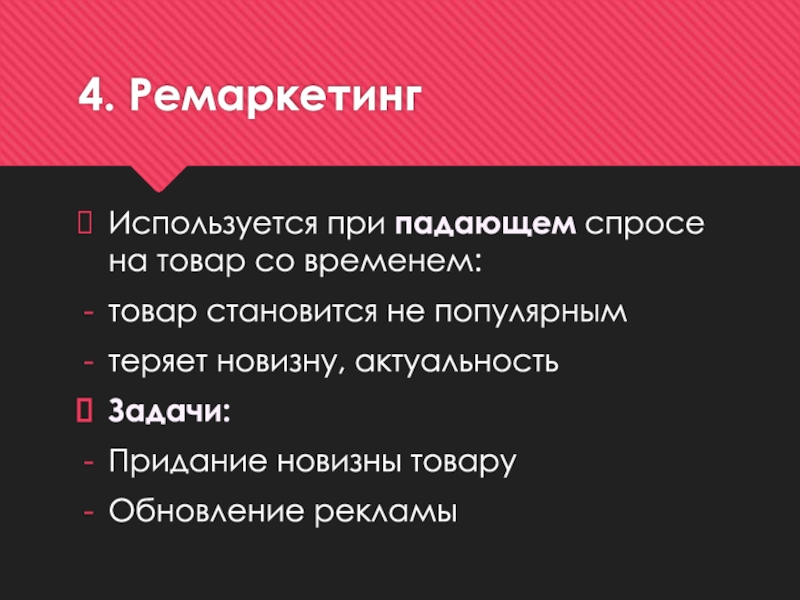4. РемаркетингИспользуется при падающем спросе на товар со временем:товар становится не популярнымтеряет новизну, актуальностьЗадачи:Придание новизны товару Обновление