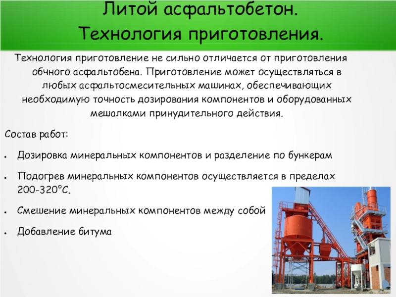 Приготовление может осуществляться в любых асфальтосмесительных машинах, обеспечивающих необходимую точность дозирования компонентов и оборудованных мешалками принудительного действия.