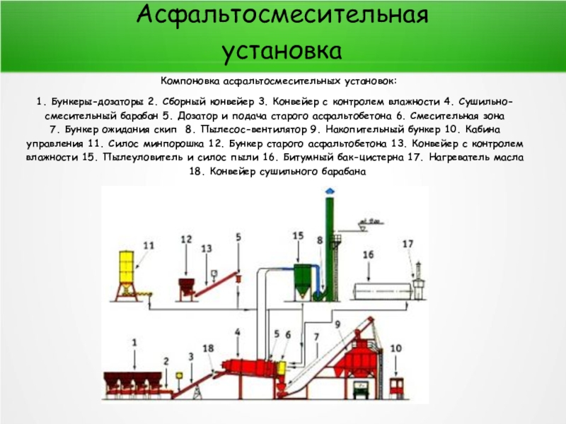 7. Бункер ожидания скип 8. Пылесос-вентилятор 9. Накопительный бункер 10. Кабина управления 11. Силос минпорошка 12. Бункер старого асфальтобетона 13. Конвейер с контролем влажности 15. Пылеуловитель и силос пыли 16. Битумный бак-цистерна 17. Нагреватель масла