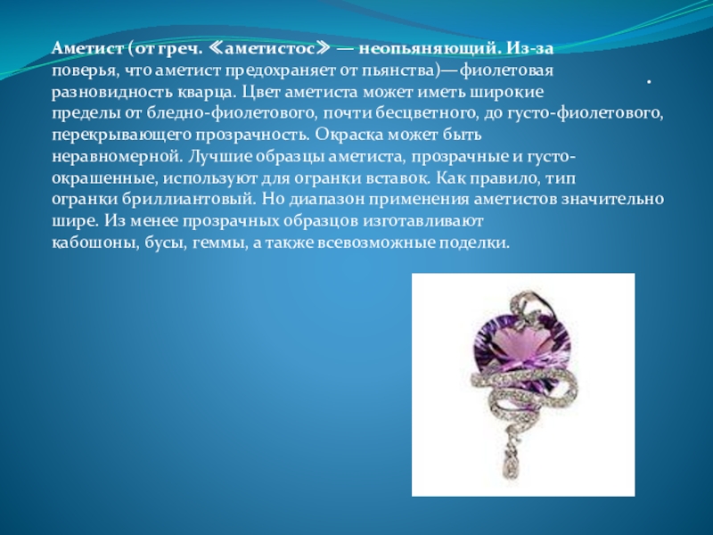Аметист (от греч. ≪аметистос≫ — неопьяняющий. Из-за
