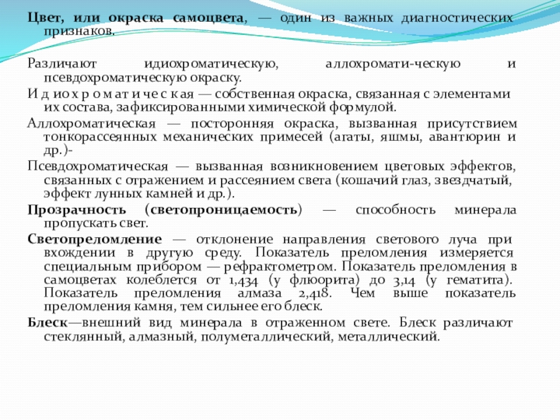 Слайд 4Цвет, или окраска самоцвета, — один из важных диагностических признаков.