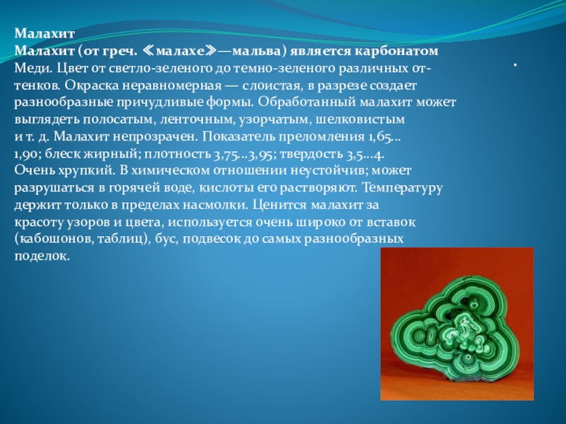 и т. д. Малахит непрозрачен. Показатель преломления 1,65...
