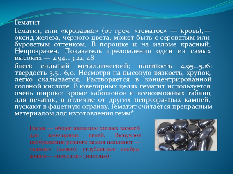 блеск сильный металлический; плотность 4,95...5,16; твердость 5,5..-6,0. Несмотря на высокую вязкость, хрупок, легко скалывается. Растворяется в концентрированной соляной кислоте. В ювелирных целях гематит используется очень широко: кроме кабошонов и всевозможных таблиц для печаток, в отличие от других непрозрачных камней, пускают в фацетную огранку. Гематит считается прекрасным материалом для изготовления гемм*.