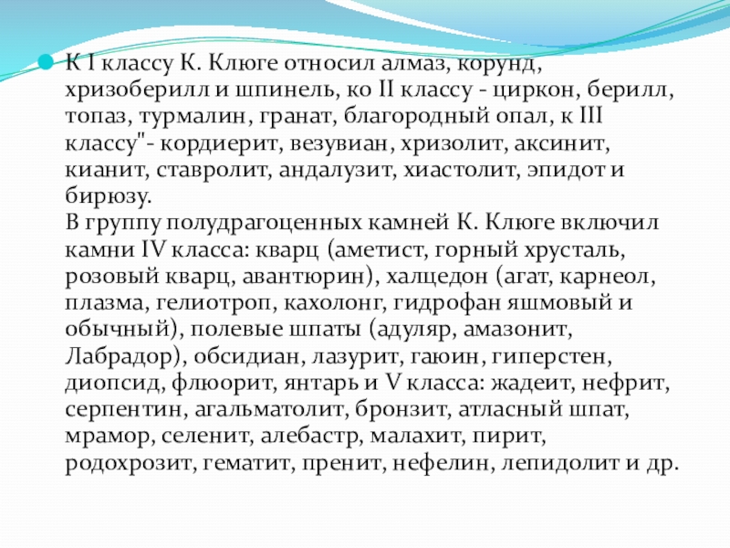 минералогии Г. Гюриха (1902г.). Все прозрачные минералы, характеризующиеся высоким светопреломлением и применяющиеся для изготовления ювелирных украшений, он объединил в драгоценные камни первого рода; отдельно были выделены полудрагоценные камни. Минералы, встречающиеся в аморфном состоянии или в виде мелкозернистых кристаллических агрегатов, от отнес к группе камней второго рода (цветным камням). По ценности Г. Гюрих разделял драгоценные камни на пять различных классов. Драгоценные камни I класса - алмаз, корунд, хризоберилл и шпинель, II класса - циркон, берилл, топаз, турмалин и гранат, а также благородный опал из группы цветных камней, III класса - кордиерит, хризолит, кианит и другие драгоценные камни, кроме того бирюза из группы цветных камней. В IV класс входили такие полудрагоценные камни, как кварц, полевой шпат, флюорит и из группы цветных камней - авантюрин, кошачий глаз, халцедоны, опал, обсидиан, лазурит и янтарь. К V классу отнесены цветные камни из группы цветных: гематит, нефелин, нефрит, гагат, змеевик, алебастр, малахит и т д.