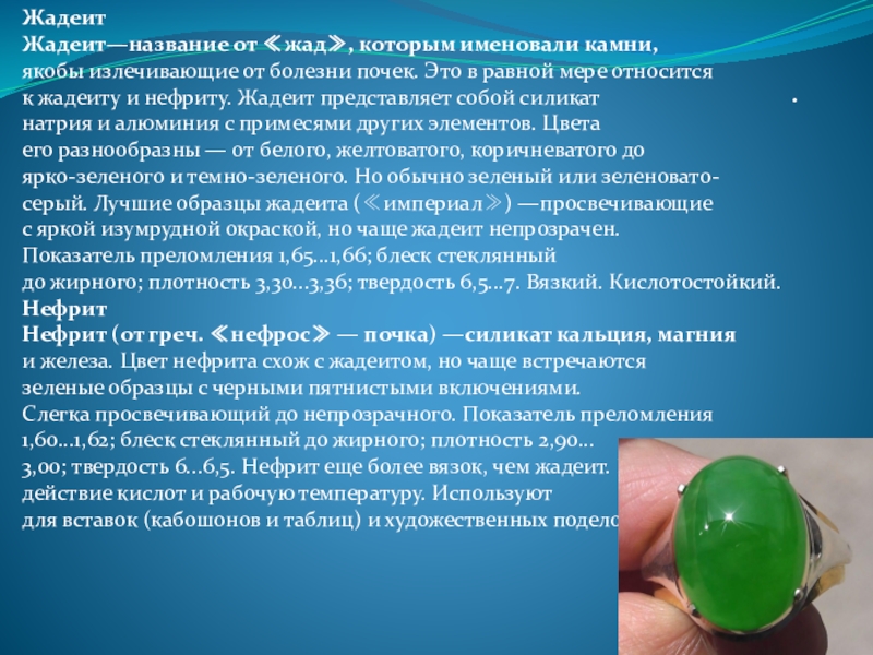 3,00; твердость 6...6,5. Нефрит еще более вязок, чем жадеит. Выдерживает