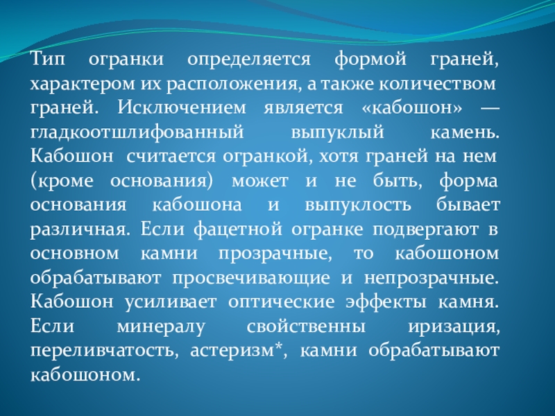 граней. Исключением является «кабошон» — гладкоотшлифованный выпуклый камень. Кабошон считается огранкой, хотя граней на нем (кроме основания) может и не быть, форма основания кабошона и выпуклость бывает различная. Если фацетной огранке подвергают в основном камни прозрачные, то кабошоном обрабатывают просвечивающие и непрозрачные. Кабошон усиливает оптические эффекты камня. Если минералу свойственны иризация, переливчатость, астеризм*, камни обрабатывают кабошоном.