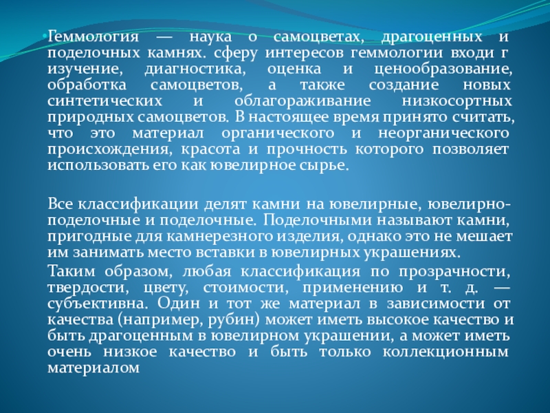 геммологии входи г изучение, диагностика, оценка и ценообразование, обработка самоцветов, а также создание новых синтетических и облагораживание низкосортных природных самоцветов. В настоящее время принято считать, что это материал органического и неорганического происхождения, красота и прочность которого позволяет использовать его как ювелирное сырье.