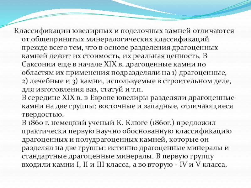 В 1860 г. немецкий ученый К. Клюге (1860г.) предложил практически первую научно обоснованную классификацию драгоценных и полудрагоценных камней, которые он разделял на две группы: истинно драгоценные минералы и стандартные драгоценные минералы. В первую группу входили камни I, II и III класса, а во вторую - IV и V класса.