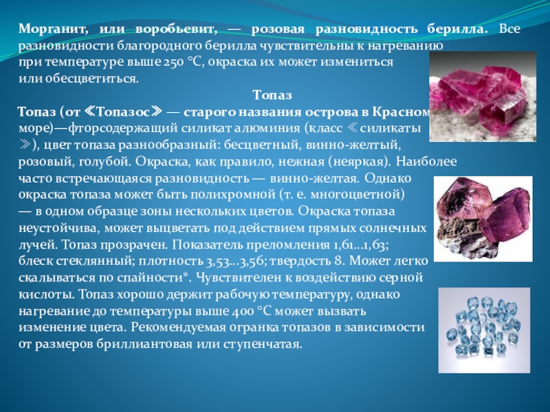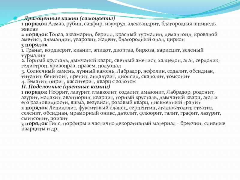 ко II классу - циркон, берилл, топаз, турмалин, гранат, благородный опал, к III классу"- кордиерит, везувиан, хризолит, аксинит, кианит, ставролит, андалузит, хиастолит, эпидот и бирюзу.