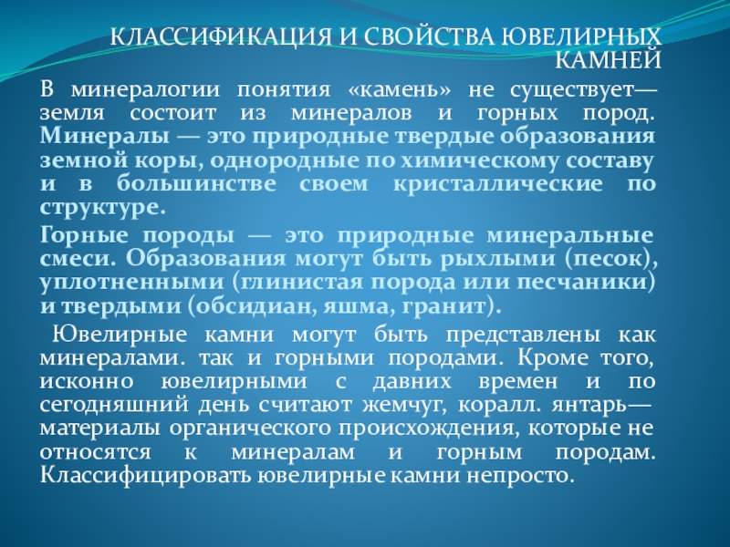 Ювелирные камни могут быть представлены как минералами. так и горными породами. Кроме того, исконно ювелирными с давних времен и по сегодняшний день считают жемчуг, коралл. янтарь—материалы органического происхождения, которые не относятся к минералам и горным породам. Классифицировать ювелирные камни непросто.