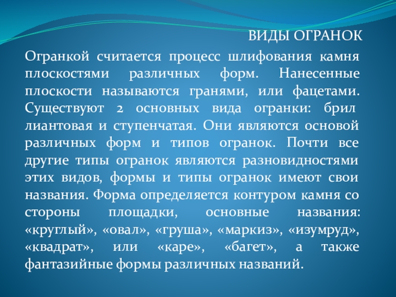 Огранкой считается процесс шлифования камня плоскостями различных форм. Нанесенные